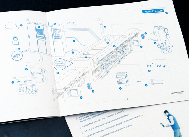 L’azienda progetta e realizza applicativi hardware e software per impianti produttivi, nuovi o già esistenti, nei settori automotive, siderurgico e metalmeccanico. L’obiettivo è aumentare la competitività dei propri clienti rendendo più efficiente e sicura la produzione, adeguando anche macchinari di costruzione non recente alle nuove norme di sicurezza. Successivamente all’installazione degli applicativi Copromec Electronics affianca il cliente garantendo, da remoto, un’assistenza 24 ore e in tempo reale, sfruttando le caratteristiche di connettività dell’hardware installato e intervenendo per aumentare e mantenere il rendimento del macchinario. La “reason why” dello scegliere Copromec Electronics rispetto ad altri attori ci è parsa chiara fin dall’inizio: per essere più competitivi nei rispettivi mercati di riferimento grazie a metodologie all'avanguardia e ai componenti delle applicazioni cablati in rete per un costate monitoraggio. “Performance are wired”. La brochure doveva mantenere un tono autorevole ma allo stesso tempo essere in grado di raccontare con chiarezza un servizio “custom”. Il cliente riscontrava difficoltà nel far capire esattamente quali fossero le proprie attività in quanto appunto specifiche e diverse per ogni progetto. Abbiamo quindi utilizzato quattro esempi di applicazioni in settori differenti che abbracciassero casistiche in cui il target potesse riconoscersi, realizzando per ciascuno delle illustrazioni tecniche ma con uno stile fresco e contemporaneo. Sviluppati tutti i contenuti, abbiamo realizzato anche il sito web.